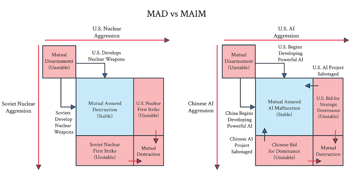 In a recent paper with a cool domain name (nationalsecurity.ai), Hendrycks, Schmidt, and Wang analyze this and propose a framework called “Mutual Assured AI Malfunction” (MAIM). Drawing parallels to nuclear deterrence and Mutual Assured Destruction (MAD), they suggest that nations will be mutually motivated to sabotage each other's AI projects that threaten to race to ASI first, creating a form of strategic stability.